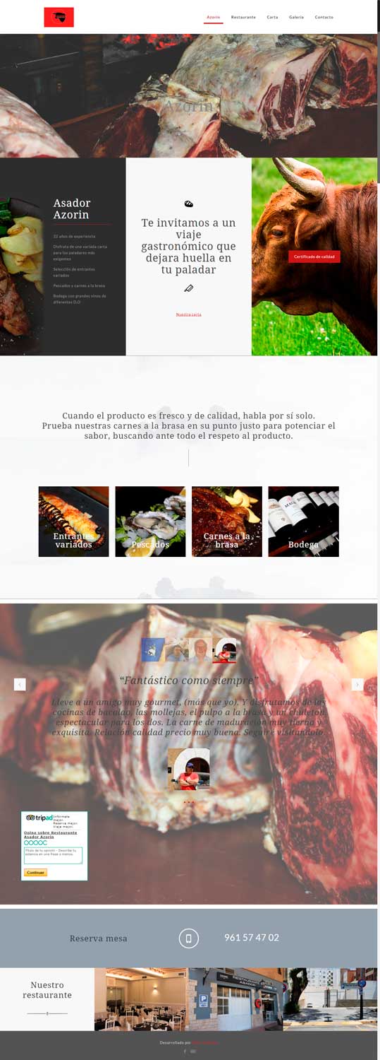Gestión de imagen del Restaurante asador Azorín de Torrent. Gestión de la presencia en redes sociales genéricas y especializadas como TripAdvisor. Diseño de página web y de contenidos para redes sociales. Página web clásica de contacto con un punto moderno.